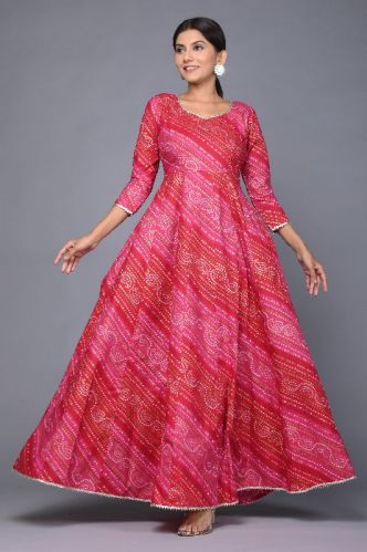 Cotton Pink Bandhej Anarkali Kurta With Dupatta?