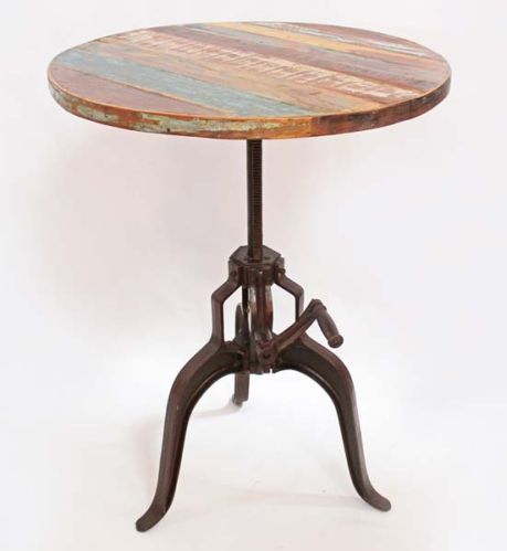 size 75x75x70-110 cm. Boat wood top and Black iron Base. Height adjustable dining to bar Table height.