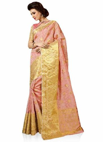 Contact SupplierAccord a classy stance by adorning this art silk traditional woven saree in light pink and cream (off white) colour. To fulfill the splendid look and make the saree a complete one shot buy, our craftsman from meghdoot has weaved the saree with zari and resham in the form of peacock and floral motif. Available with an unstitched art silk light pink colour blouse measuring 85 cms. Blouse shown in image may vary slightly in design and colour.