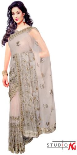We are offering cream colour georgette embroidered saree. look graceful wearing this cream colour georgette embroidered saree. it is designed with zari, sequins work and designed patch border enhances grace of the saree. Matching blouse fabric comes with the saree.