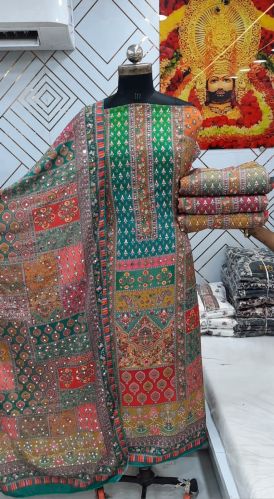 Natural crepe digital printed top from front and back both with heavy mirror work on front side of the top and bottom is also of same fabric plain natural crepe dupatta is also of digital print with heavy mirror work and pikko from both the ends