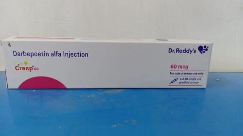 Contact SupplierWe offer Cresp 60, a Darbepoetin Alfa Injection in a convenient prefilled syringe form for easy administration. Each 0.3 mL single-use syringe contains 60 mcg strength, manufactured by Dr. Reddy's Laboratories. This Rx-only medication is prescribed for treating anemia in CKD and chemotherapy patients. Administered via subcutaneous injection, it is recommended to store this product refrigerated at 2-8°C. Trust Cresp 60 for effective anemia management, brought to you by a reputable manufacturer, exporter, and supplier in the healthcare industry.