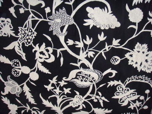 We are offering crewel fabric chelsea white on black cotton duck.artisans in a remote mountain village in kashmir crewel stitch these blossoms, vines and leaves by hand, resulting in a lush pattern of richly shaded wool yarns on linen, cotton, velvet and silk. fabric type:cotton duck fabric detail:cotton with wool jacobean embroidery pattern:chelsea color:white on black width: 55.1181 inches vertical repeat:42 " horizontal repeat:58