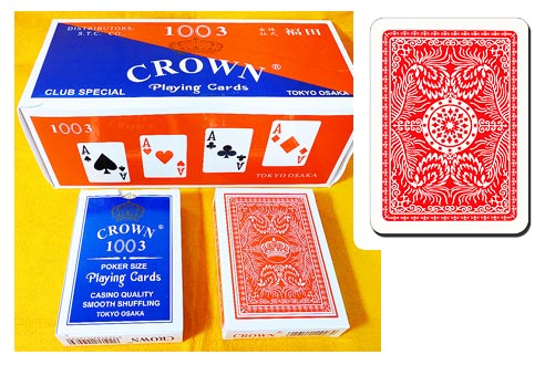 CROWN premium playing card 1003 size: 2.5" x 3.5" color: red blue material: paper w plastic coated & linen finish packing: 1 doz paper box carton: 24 doz carton dimension: 42.5 x 40 x 24 cm carton weight: 27 kg moq: 1200 doz (consolidation allowed).