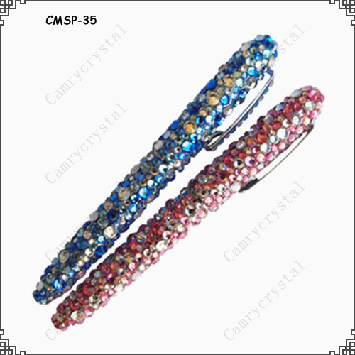 We are offering pinkblue crystal rhinestone ball point pen. 1. Item no.: cmsp-35 2. Product name: pinkblue crystal rhinestone ball point pen 3.material:metal with chrome plate 4.pen with rhinestones, each stone placed by hand piece by piece. No machines are used. 5. Various stones colors, size, logo and packing are all available 6. Can be designed as per customers' requests 7. Prompt delivery and good service base on competitive price. 8.more than 20 design selectable.