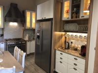 For this project a combination of solid wood, bleach finishes, melamine and wrapping with granite tops was used to create a cottage style kitchen. The ceramic basin, butcher block, woven baskets, lighting and appliances, were all supplied and installed by Prestige Wooden Products.