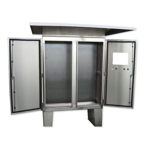 Custom floor-mount, double door cabinet with false top with sunscreen and adjustable back panel. 3-point latching on each door with cutouts.