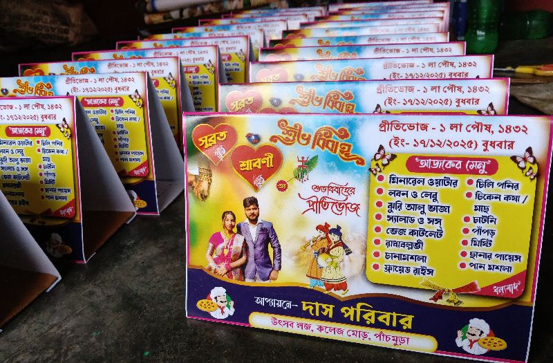 We provide professionally designed wedding menu cards in Bengali and English. Our custom marriage menu cards are perfect for weddings, receptions, and special events. We focus on attractive design, clear food listing, and premium printing quality to make your special day memorable. Bulk orders and customization available.