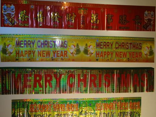 We offer customer party banner. Holiday banner 1) size: 11.5cm( width) x 2.7 meters( length) or other sizes as your request 2) colors: cymk printings, pantone colors 3) material: metallic holographic bopp film or metallic foil 4) thickness: 20 microns 5) packing detail: each banner packed in a polybag with headcard or as client’s request of your own market 6) making sample time: 7-10 days 7) delivery time: within 20-30days after receiving the deposit or lc 8) m.o.q: 10,000 piece 9) customer’s designs acceptable, welcome oem designs 10) used for birthday party decorations