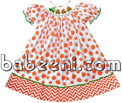 Contact Supplierfeature: cute hand smocked bishop dress on thanksgiving day with pumpkin and train hand smocked pattern around the neck, elastic short sleeves