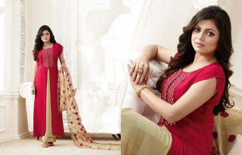 We are offering georgette embroidered anarkali type suit georgette top:red,santoon bottom:cream,georgette dupatta:cream,inner:rosilk,size:1.90 mtr top,2.25 mtr bottom,2.25 mtr dupatta,pattern:embroidered ,occasion:party wear,dry clean only anarkali type suit.