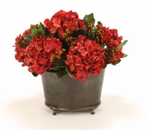 7657# - Dark Red Hydrangeas w Salal and Cotton Phylica in Black Oval Planter Container Material Man-Made Material Dimensions Height" x Width" x Depth" 19 x 21 x 18 Dominant Color Claret Dominant Color Family Reds Shipping Weight 21 Ships