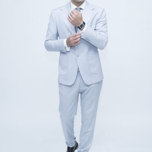 Light grey and blue mixed special hot weather edition cotton suit with smart looking patch pockets. It looks so elegant and casual at the same time which makes it universal and flexible for daily use. It can be worn in different occasions, at work and just as a daily wear. Light grey jacket is also easy to match with many ties and shirt tones.