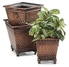 Set of 3 Brown square tin planters with diamond design and claw feet. Handles on each side of planters Large planter measures: 8 12"H x 8 34"W x 8 34"d Medium planter measures: 7 14"H x 7 12"w x 7 12"D Small planter measures: 6"H x 6"w x 6"D Plants not included