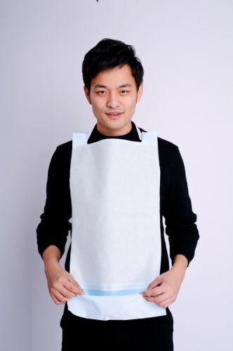 we offer Dental Bibs. Specifications Disposable Dental Bib with pocket Material: tissue paper+pe film Size:32*20cm,40*28cm or as demand Weight: 30-50gsm Detnal Bibs with pocket Feature: 1. Material: 12 tissue paper + pe film 2. Size: 13"*18",can be produced as per customers'requirements 3. Weight: range from 28gsm to 50gsm 4. Color: white,blue,green,pink,yellow,purple,and so on 5. Packaging:Piece or perforated roll packaging, 6. Advantage: sanitary, disposable, convenient, economical and environmental