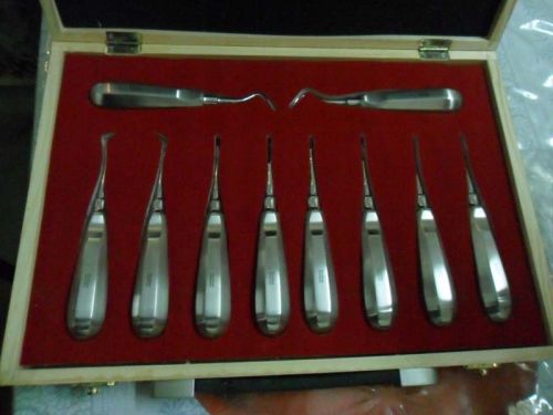 We are offering dental root elevators. 10 pcs. Of dental root elevator set packed inside beautiful wooden case with foam and velvet packing inside. Ideal for professionals and students to carry anywhere.