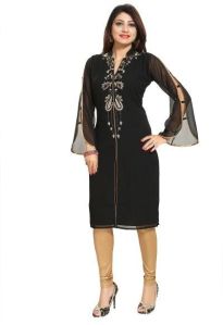 Description Join the fashion bandwagon as you adorn this Designer Black Beauty Georgette Long Tunic with Stylish Sleeves from Snehal Creations for a fun evening out. This georgette tunic comes with delicate handwork on the ban collared neck and underneath it. The sleeves are long and feature a slit with a designer edge to them. A pair of golden jeggings will work beautifully well with this one.
