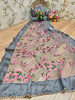Embroidered Dark Grey Net Saree, Saree Length : 6.3 Meter