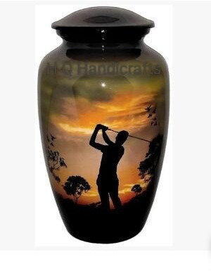 Technique Printed Style Modern Arts Size 10" Regional Style Indian Product Type Aluminium classic Designer Golfer Printed Ashes Cremation Urn