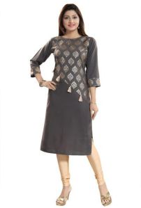 Description Sizzle the party you be a part of as you wear this The Dress-up Game Designer Poly Crepe Dull Grey and Gold Party wear Tunic with Pom Poms. This Snehal Creations piece features a boat neckline and three-quarter sleeves with printed cuffs. The front of the tunic has diagonally aligned gold motifs printed on it. Matching pom-poms adorn the tunic too and make it stand out. Wear a pair of dull gold leggings with this.