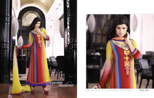 We are offering fancy designer printed long suits collection in wholesale. The catalogue has 9 exclusive pieces in pure chiffon and georgette with pure chiffon dupatta and cotton satin bottom. All salwar kameez suits are unstictched and have great feel and fall. Exclusive 10 pieces designer collection for those bored of typical anarkali suits and dresses. Catalogue name is "pure chiffon". Contact us to know more about this product and our other products.