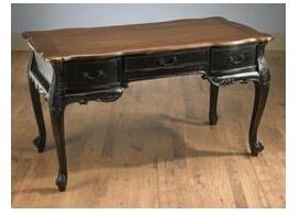 Distressed wood with distressed black painted finish and medium brown finish top. Caved accents and three drawers.Dimensions 32x55x28 Weight 0.0000 lbs