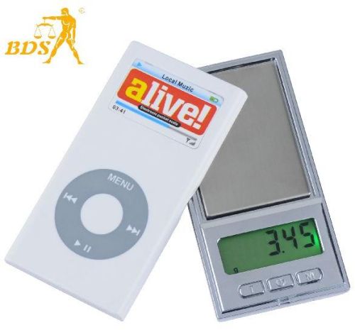 Model name :  BDS-DH Units : g,oz,gn,ct Capacity : 100g/0.01g,   200g/0.01g Scale size : 97*50*11mm Carton size : 37.6cm *29.8cm *23.7cm Scale color : white Power : 1*2032(included) Packing : 50 pcs/carton,10kg,color box Features :Styled like an apple MP3 Large Stainless Steel Weighing Platform LCD display ,blue backlight 60 seconds automatic shut down