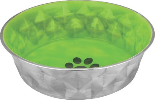 Heavyweight, solid, premium stainless steel Dogs & Cats Heavy bowls. Out Side Diamond Design - Looks Gorgeous. Inside Stainless Steel Finish or Ceramic Finishes. Paw Printed. 100 % Silicon Bonded Non-Skid bottom prevents sliding. Heavy Gauge Stainless Steel is dishwasher safe. Highest Blend of Chromium for strength & Nickel for durability / finish. Stainless Steel Resist Bacteria, Stains, rust & breakage. Available in Grey, Green, blue, Purple & Red Colors.