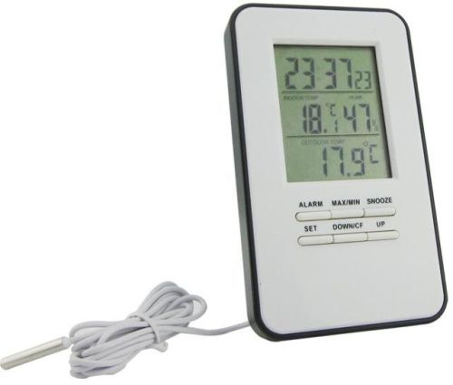 We have Digital Clock. Led backlight: time, date, day, alarm, snooze, moonphase min/max records to temperature and humidity temperature in c/f 12/24 hour switch, indoor relative humidity range-50---70c battery:aaax2 not included.