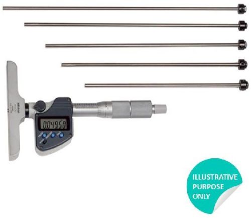 Mitutoyo 329-350-10 | Digital Depth Micrometer 0-150mm / 0-6 inch A Mitutoyo digital depth micrometer using interchangeable measuring rods to cover a wide measuring range. The 100mm base is made from tool steel, hardened and ground with a micro-lapped reference surface. A ratchet stop guarantees repeatable measurement. Digimatic data output.