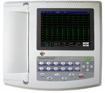 12channel ecg machine with 8 inch touch and color screen,multi-language report formats pioneer ekg 1212t has large capacity (1000 exam),12 leads ecg simultaneous acquisition,digital signal processor,built in battery and acdc power supply