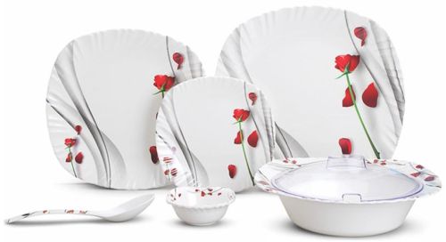 We are offering 41 pcs. Dinner set - square round shape-tulip. combination : 6 nos dinner plates 6 nos small plates 12 nos katori 3 nos serving bowl 3 serving bowl lid 1 rice plate 4 serving spoon 6 desert spoon
