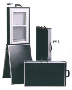 These lightweight but rugged display cases not only protect your double hung, slider, and storm window samples, they also transform into a sturdy eye-level display. By simply sliding window samples out, easel legs automatically spring open. When demonstrations are completed, easel legs are folded, and window samples slide down into a protective shell.