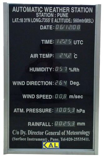 The weather display unit is used to monitor online weather parameters.Automatic weather station (AWS) is made to install outside which measures weather parameters like Temperature, Wind, pressure, rain etc.