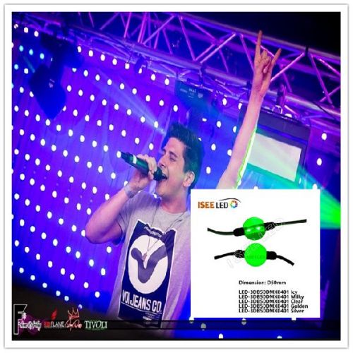 Contact SupplierDMX rgb 50mm pixel 3d ball light DMX rgb 3d ball light are designed to form a video light curtain with 200mm pixel pitch. diameter 50mm pixel 3d ball can make 25PCS LED balls in a string, 30PCS LED balls in a string, 45PCS LED balls in a string with 200mm pixel pitch. Each pixel 3d ball light contains 4PCS powerful RGB LEDs built into the Milky white moulding.The 50mm led pixel ball advantages include: 1. The uniqueness of a full view angle of 360°2. The creativity to display 3D effects and content3. The flexibility of extending the length of a string (up to 8 m)4. IP65 rating These IP65 rated LED Pixel Balls can be viewed in 360° and be used to create alluring 3D spatial effects. DMX rgb 50mm pixel 3d ball light  Application This makes them suitable for a wide range of applications, including TV scenography, theme parks, exhibitions, video art, clubs, shopping malls - and just about any fixed installation.  Model NO.  LED-3DB50DMX0401  LED-3DB40DMX0401  Diameter  50mm  40mm  LED  4PCS SMD RGB 5050  Emitting angle  360 degrees  Color  ■■■ RGB full color  Voltage  DC 15V  Power  MAX=1W  Protocol  DMX512  Control Mode  DMX Artnet DMX DVI Standalone