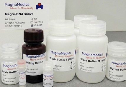 MagSi-DNA saliva is a magnetic bead-based kit for extraction of DNA from human saliva or buccal swabs. The kit includes magnetic beads, buffers and Proteinase K, and is easy to automate for high-throughput processing. DNA is suitable for use in downstream applications such as PCR, genetic typing, SNP and mutation analysis and forensic analysis. MD60002: MagSi-DNA Saliva 96 preps MD61002: MagSi-DNA Saliva 10x96 preps MD62002: MagSi-DNA Saliva 10x960 preps
