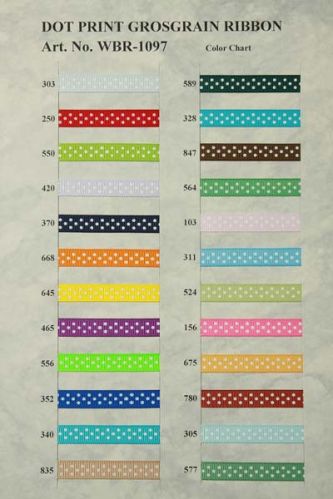 We are offering Dot Print Grosgrain Ribbons(1-24 colors). Over 196 available colors available size:9mm - 89mm double face tumble or drip-dry machine-wash warm dry cleanable less than 2% shrinkage.