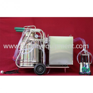 Motor power: 150 watt, (12 volt DC) Battery size: 35 Ah Min Battery voltage: 12 Volts Dry weight: 38 kg without battery Time for milking: 4 to 7 min/cow Vacuum level: 350mm Hg max Pulsing: Alternating (two teats/stroke) Pulse rate: 72/ min Cleaning method: Pumping Boiling water and cleaning agents Mounting: On stainless steel trolley with polymer wheels Adaptability: One animal at a time