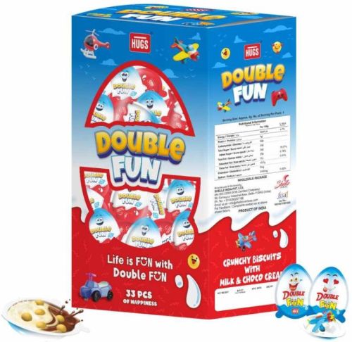 Enjoy Hugs Double Fun – a delicious egg-shaped treat filled with chocolate, milk cream and biscuits. Also, disc