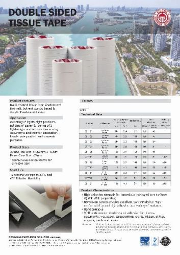 Good quality double sided tissue tape suitable for mounting of light article for temporary applications i.e : posters, notice, statement, name plate, etc. Easy removal and doesn't leave glue residue. Available to you now cheaply. Contact us now.