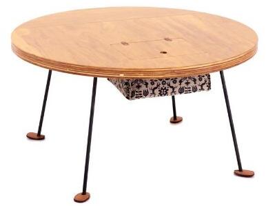 HAND BRUSHED HI-GLOSS FINISH WITH BLACKENED STEEL LEGS, VEGETABLE-TANNED LEATHER FEET AND INSET CUBBY WITH LEATHER HINGES. AVAILABLE IN 15" COFFEE TABLE HEIGHT 19" KIDS TABLE HEIGHT APPROX: 36 DIAMETER APPROX LEAD TIME: 4 WEEKS