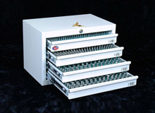 The cabinet shown here was specifically designed with our customer to hold an assortment of pin gages which are used to verify hole diameters with very high precision. Manufacturing facilities use pin gages routinely and this cabinet allows for clean, compact, and secure storage of these expensive precision measuring tools. The cabinet’s versatile design lends itself to many other uses, its basic design can easily be modified allowing it to be used for a wide range of secure storage applications for tools and small parts.