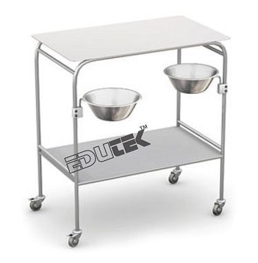 Dressing Trolley Dressing Trolley made of tubular pipe construction total over all size of 30"X20"X32" the trolley with S.S. top finished with powder coated paint units moved on castors Two with breaks and two without breaks provided with two S.S. shelves, hinges of stainless steel Rod On the all the three sides for the support on both the shelves upper and lower.