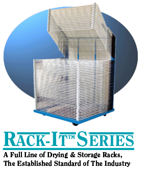 A.W.T. Rack-It heavy Duty drying racks represent the common sense application of long time industry knowledge. We use steel bumpers because they outlast rubber, and we weld them to the outside of the shelf so you have more drying room. Each shelf spring is individually adjustable so you can control updown operation. The powder coated shelf finish is rust and solvent resistant for a long service life. The non-warping shelves are spaced at 1" intervals (2" available) to maximize solvent evaporation. For baking applications, heat resistant models are available.