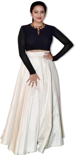 We are offering dupion embroidered blouse, an elegant designer black and off-white blouse skirt with crystal and sequins work on the neck. The fabric used is polyester dupion and shantoon.