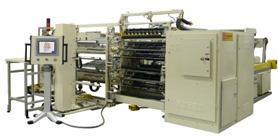 Dusenbery® Model 637 Slitter Rewinder w/ Model 632 Auto Leader/Trailer/Inserter designed for continuous 24 hour, seven day operation in a manufacturing environment.
