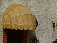 Awning is shaped like a cap and it is one quarter of a sphere. Awning frame is made of natural anodized aluminium profile of 18 x 45mm size. Hinges are made of synthetic resin. Fabric is stapled to aluminium profile with brass nails and matching color beading covers the nails. The height and the projection of the awning is same and the width is two times of projection.
