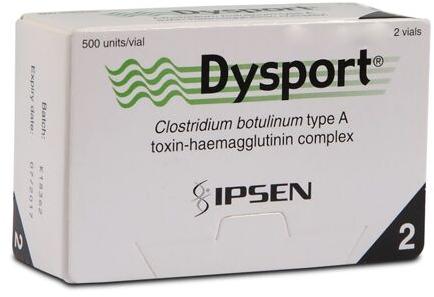 Contact SupplierWhat is DYSPORT 2X500IU? Dysport uses its neurotoxin active ingredient derived from bacteria to inhibit the release of an important chemical in the nervous system. The effects are that corresponding muscles don�t receive the chemical messenger which will usually make muscles begin to contract and spasm. What can DYSPORT� do? DYSPORT� is available by prescription. It is injected into muscles to treat neck pain and the patients head position which can look abnormal due to cervical Dystonia. Dysport can also be used to treat the look of deep vertical frown lines between the eyebrows which can have a psychological impact on individuals under 65. The effects are only temporary for four months, while muscles are being weakened without the presence of the chemical messenger being inhibited.