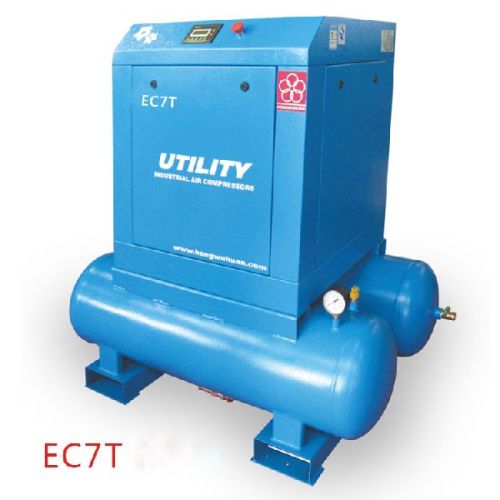 Contact SupplierEc7t 10hp screw air compressors with tank are easy to move, suitable for use in the traditional industrial and household areas.the efficiency of 10hp screw air compressors with tank is high,noicse is low. 10hp screw air compressors are matching enlarged mute-type axial fans to ensure sets to operate normally under high temperature conditions. Ec series technical parameters                                                                model parameters ec7t ec7 ec11 ec15 ec22d ec37d ec55d air displacement m³/min 1.15 1.15 1.62 2.3 3.6 6.1 10.2 discharge pressure mpa 0.8 compressed stage single motor power kw 7.5 7.5 11 15 22 37 55 motor speed rpm 2950 power supply v/p/hz 380/3/50 start mode direct start y-△ drive mode belt drive direct drive air inlet size g3/4" g3/4" g3/4" g1" g1" g1-1/2'' g2" cooling method air cooling length mm 1165 705 905 905 1180 1340 1600 width mm 725 600 745 745 800 900 970 height mm 1170 950 1055 1055 1100 1240 1450 net weight kg 250 210 290 310 500 780 1300 certificates.