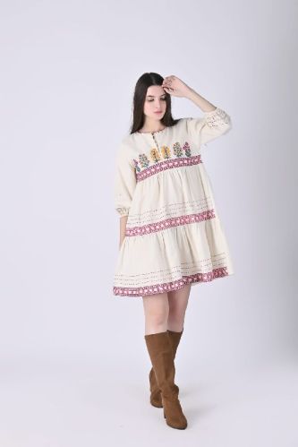 The Vintage-inspired featuring in all-over Rice stitch contrast embroidery, contrast lace patch on yoke, Round neck, frill with eyelet lace.